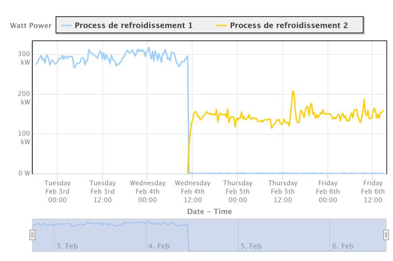 Un exemple très concret chez un client industriel ce mois. Jusqu’à mercredi midi, le process de refroidissement historique tournait autour de 280 à 300 kW.